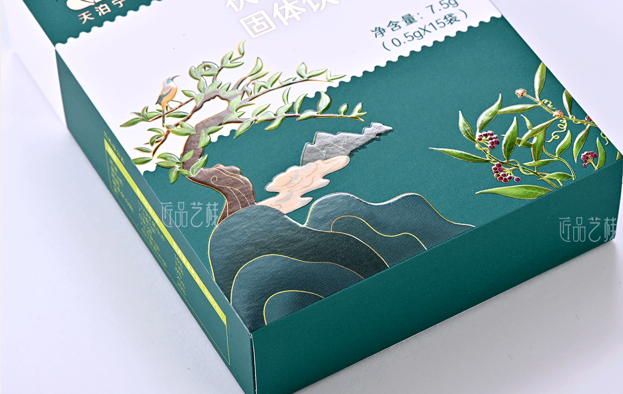 如:與天泊寧品牌(生物科技優(yōu)秀企業(yè))從設(shè)計到印刷整體完成的固態(tài)飲料產(chǎn)品包裝盒案例: