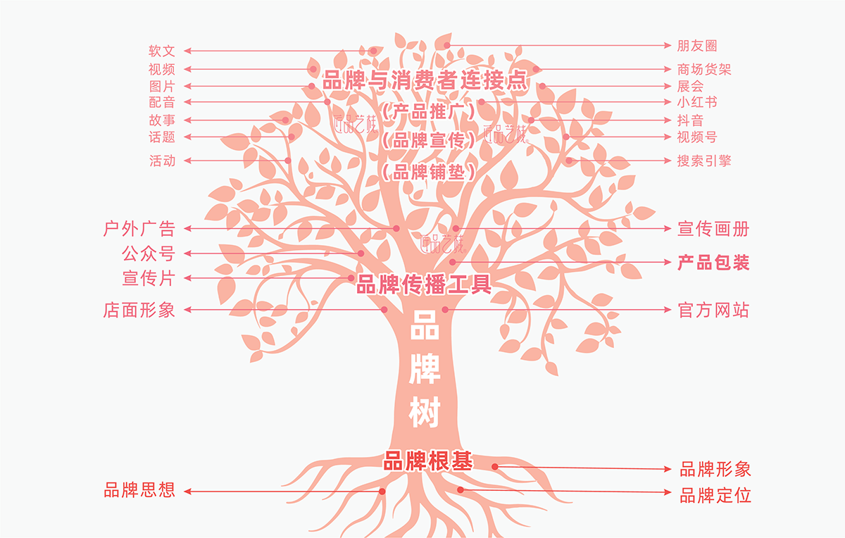 品牌樹的根基,主要包含“品牌定位”、“品牌思想”、“品牌形象”三大方面。