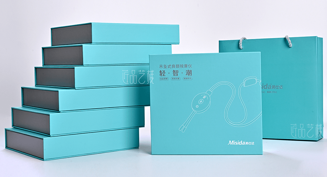 在該肩頸按摩儀包裝盒定制合作中,以簡約時尚的藍(lán)色調(diào)為基,