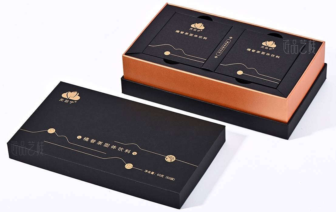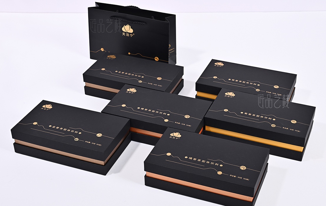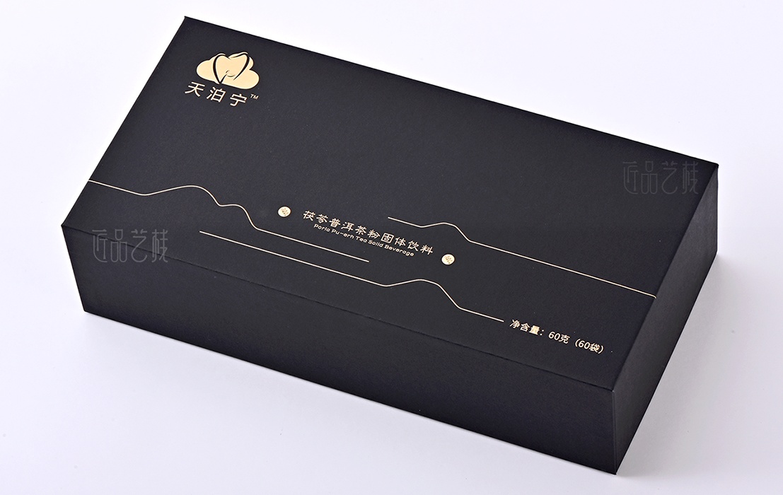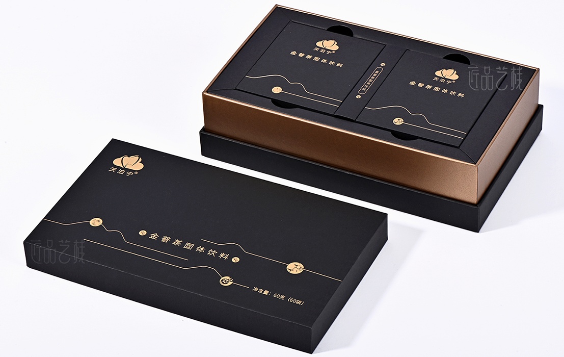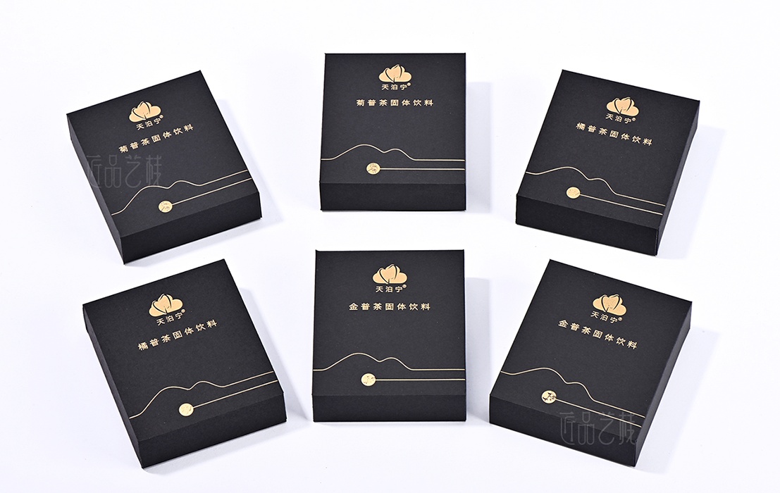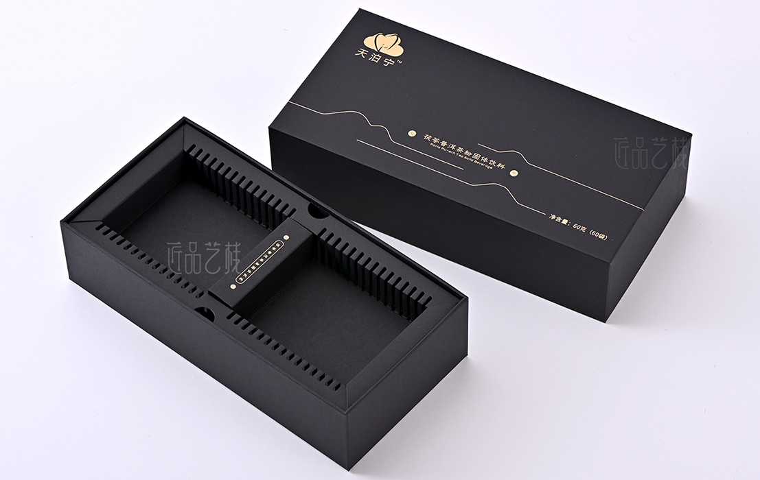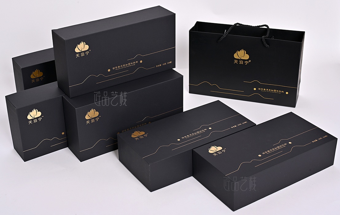 依托a級黑色卡紙為包裝盒主體,點輟精致燙金工藝,