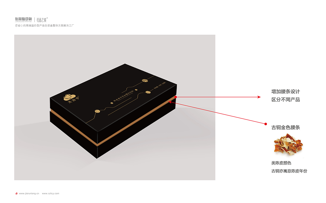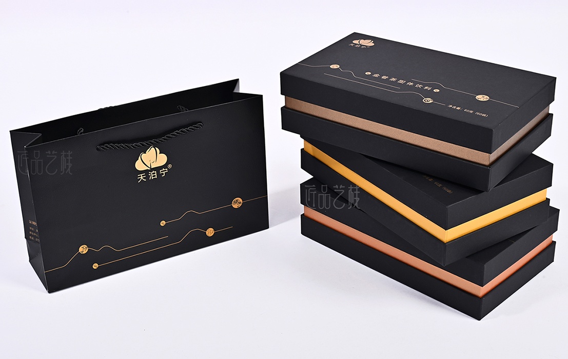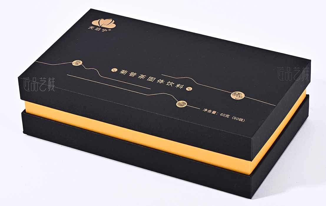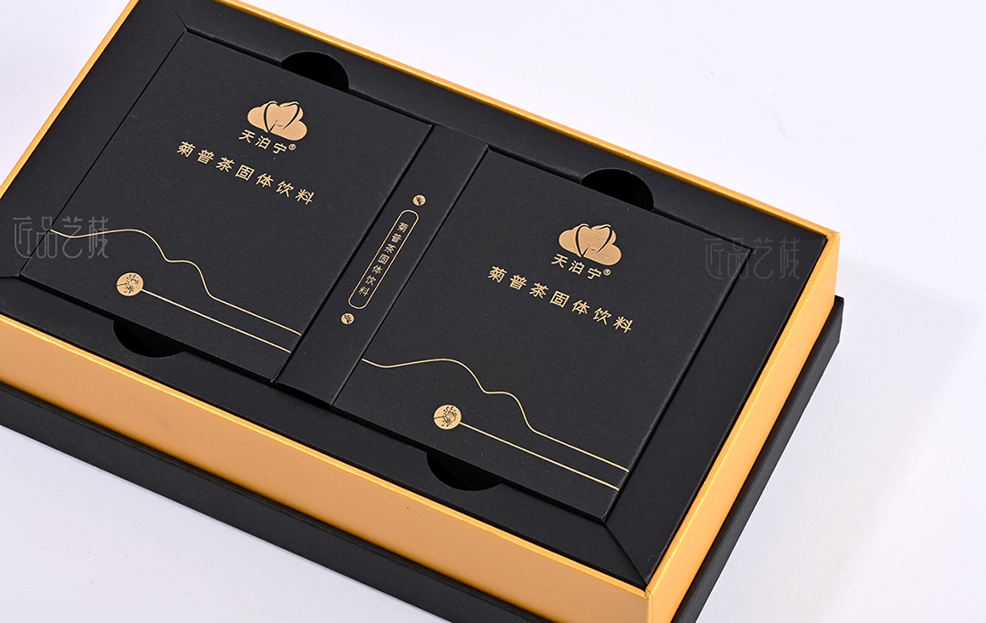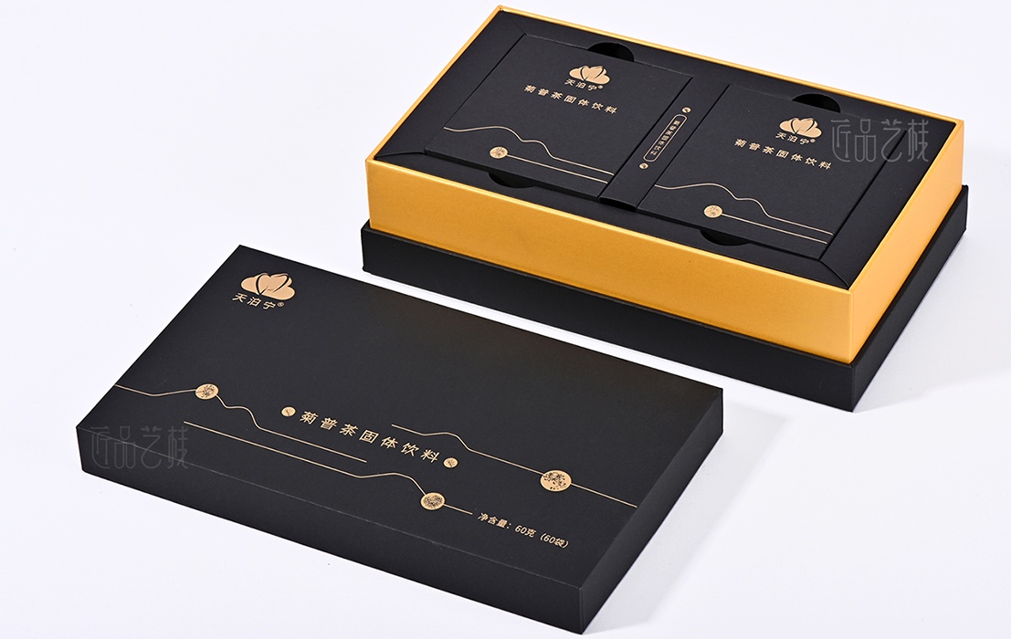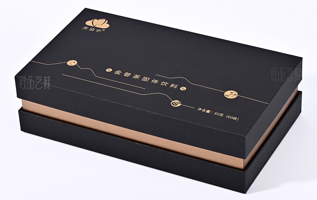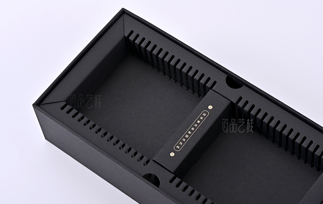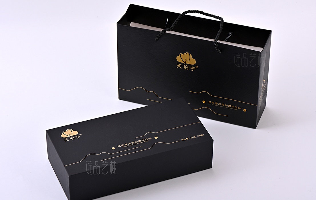 依托a級黑色卡紙為包裝盒主體,點輟精致燙金工藝,